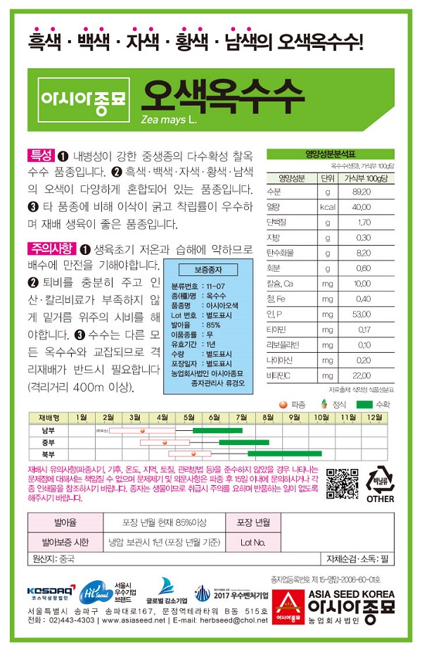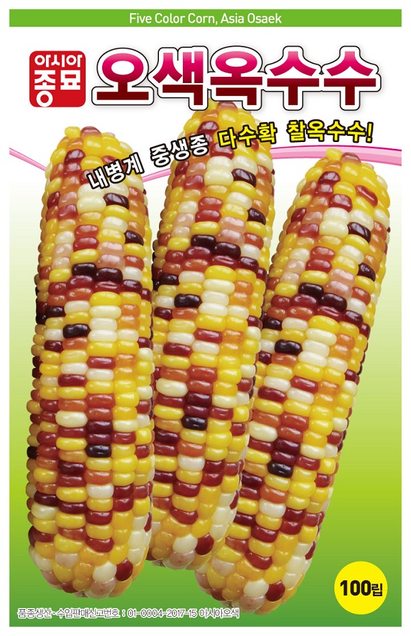 오색옥수수는 본래의 씨앗의 색은 본래 진한 자색으로 재배 시 옥수수이삭의 색은 흑색, 자색, 황색, 남색, 백색의 오색의 색이 다양하게 발현 됩니다.